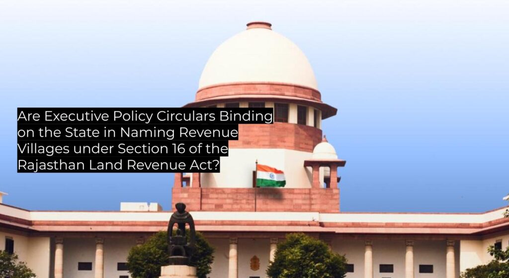 | Questions of Law | Whether a State Government policy circular (Clause 4, 20.08.2009) barring names based on individuals binds the executive in creating revenue villages under Section 16 of the Rajasthan Land Revenue Act, 1956. |