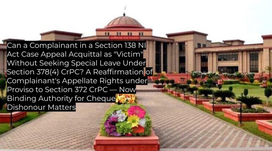 The judgment affirms that a complainant in a cheque dishonour (Section 138 NI Act) case qualifies as a “victim” under Section 2(wa) CrPC and may appeal an acquittal under the proviso to Section 372 CrPC without seeking special leave under Section 378(4). This reflects a binding clarification of appellate rights, consolidating Supreme Court precedent for […]