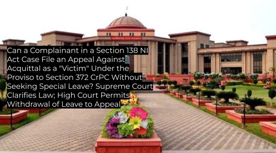 Can a Complainant in a Section 138 NI Act Case File an Appeal Against Acquittal as a “Victim” Under the Proviso to Section 372 CrPC Without Seeking Special Leave? Supreme Court Clarifies Law; High Court Permits Withdrawal of Leave to Appeal