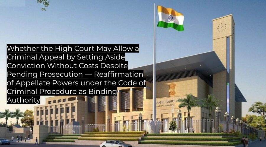 The High Court clarified its authority under the Criminal Procedure Code to allow criminal appeals by setting aside convictions, even when the prosecution is still pending, and disposed of the matter with no order as to costs; this reaffirms existing precedent and stands as binding authority for subordinate courts in Andhra Pradesh. Summary Category […]