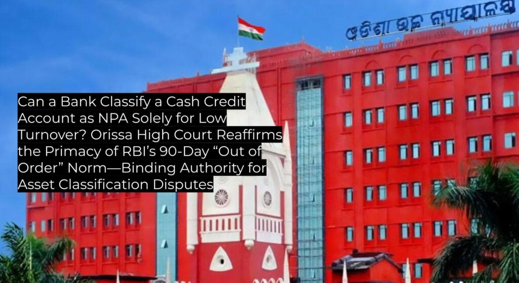 Orissa High Court holds that banks cannot classify a borrower’s cash credit account as a Non-Performing Asset (NPA) based purely on low turnover unless the objective 90-day “out of order” criteria under RBI guidelines are satisfied. This decision upholds established RBI norms, clarifies the limits of bank discretion, and is binding on all subordinate courts and persuasive for similar disputes nationwide, especially in MSME lending and asset classification contexts.