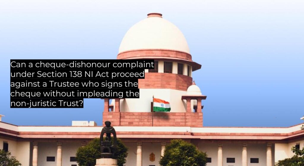 Can a cheque-dishonour complaint under Section 138 NI Act proceed against a Trustee who signs the cheque without impleading the non-juristic Trust?