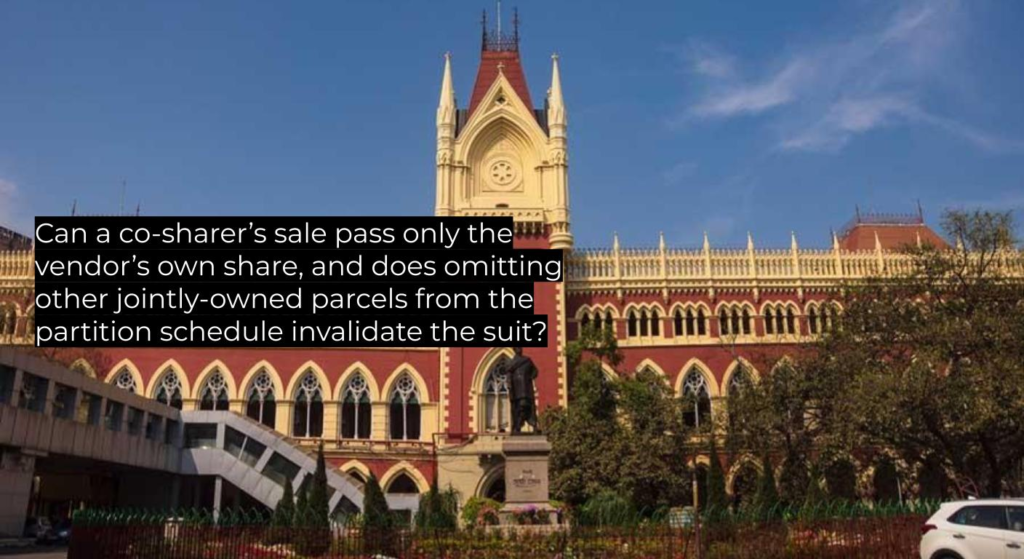 Calcutta High Court answered affirming that a co-sharer may convey only the share he actually holds and that a partition suit need only schedule the specific parcel in dispute. This upholds settled civil property precedent and serves as binding authority for future partition cases.