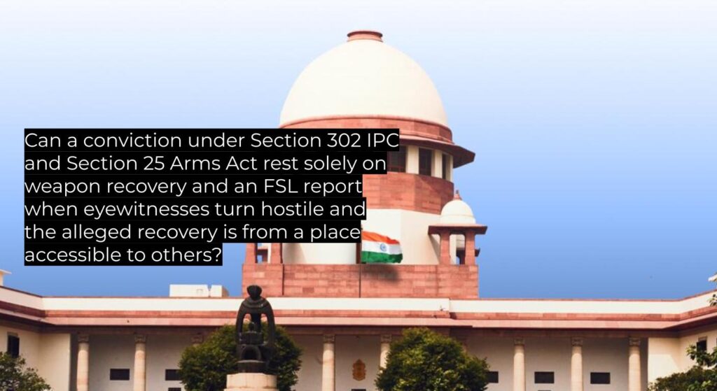 | Questions of Law | Whether conviction can be based solely on a weapon recovery and FSL report when (a) eyewitnesses turn hostile, (b) no test-identification parade, and (c) recovery is from an unlocked box in a house accessible to others. |