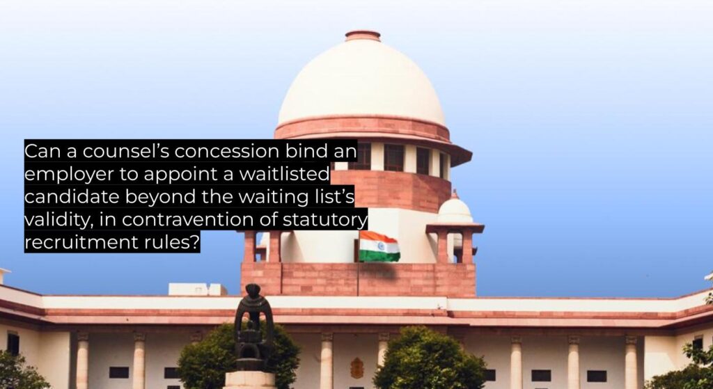 The Court held that a waiting list is operative only to fill vacancies caused by non-joining of selected candidates and cannot persist indefinitely once vacancies are filled or a fresh recruitment begins. A concession by counsel to absorb a waitlisted candidate does not override statutory Recruitment Rules. Erroneous concessions on questions of law may be corrected when compliance would violate the statute and prejudice fresh candidates. Enforcing the 15.01.1999 assurance would have required appointing a candidate 25 years later, conflicting with both the Recruitment Rules and settled service jurisprudence. The Division Bench’s direction to absorb the respondent was therefore unsustainable. |