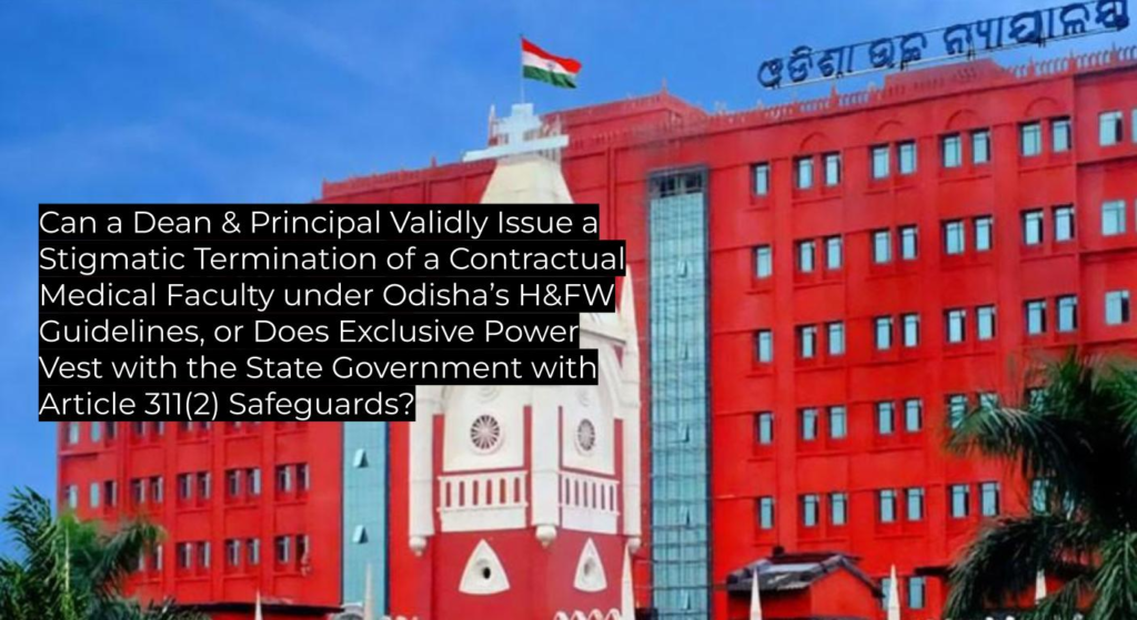 Does the Orissa High Court reaffirm that disciplinary (stigmatic) termination of a contractual assistant professor requires compliance with Article 311(2) of the Constitution and that only the State Government (H&FW Department), not the college Dean, has power to terminate under Resolution No. 8967/H dated 25 April 2022?