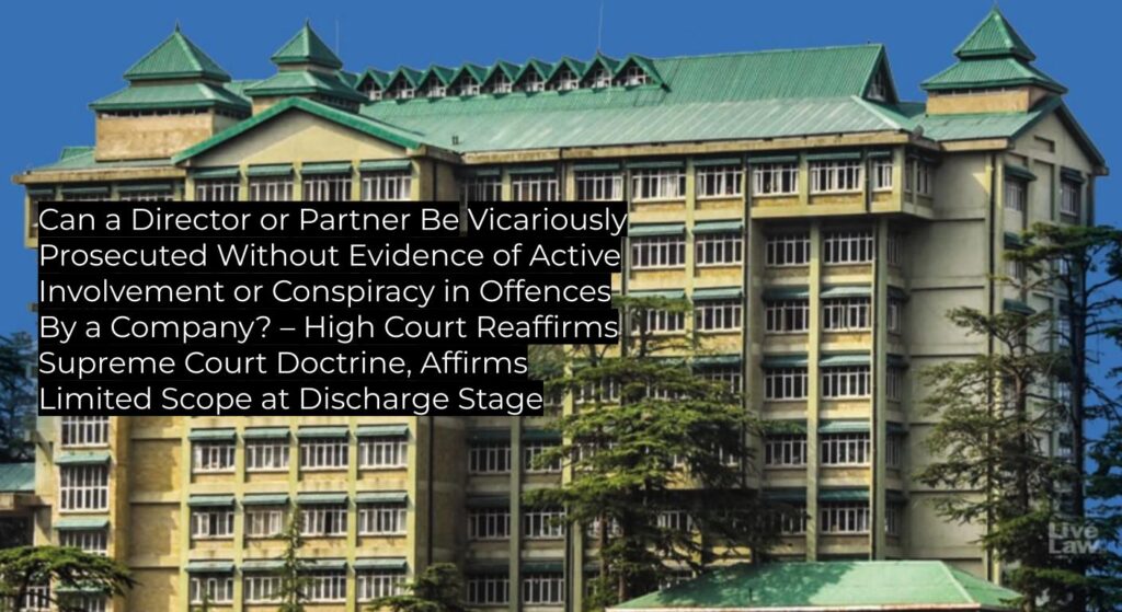 The Himachal Pradesh High Court clarified that vicarious criminal liability of directors/partners does not arise automatically without specific allegations of active role or criminal intent; at the stage of discharge, courts are confined to assessing prima facie material and cannot embark on a detailed evaluation of evidence. This decision upholds and applies established Supreme Court precedents, reinforcing the limits of criminal prosecution against company officers and setting binding standards for subordinate courts.