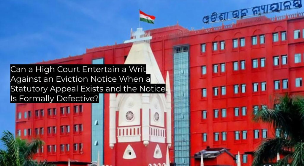 The petitioner received an eviction notice dated 01.08.2025 from the Tahasildar, Bhuban, and filed a writ petition challenging it. Counsel for the state pointed out the availability of a statutory appeal remedy against the notice. The notice had not been issued in the prescribed Form Kha. The High Court treated the defective notice as Form Kha and directed the petitioner to file an appeal with interim protection within 15 working days. The appellate authority was instructed to decide the appeal within three months, and no coercive action was to be taken pending disposal.