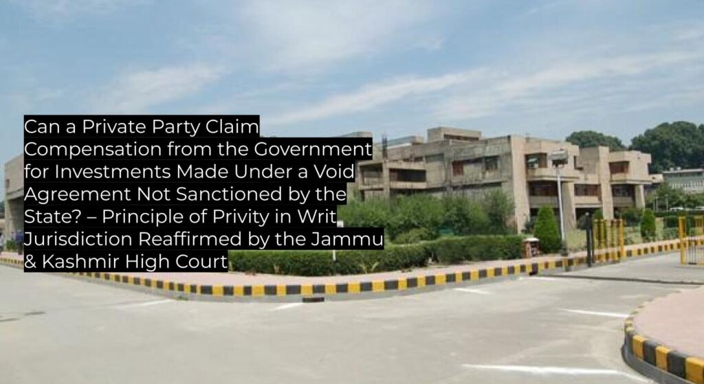 The Jammu & Kashmir High Court has reaffirmed that a private party cannot seek compensation from the government in writ proceedings based on an agreement not executed with or sanctioned by the government; privity of contract and prior adjudication bar such claims. This judgment upholds existing precedent and serves as binding authority for subordinate courts within Jammu & Kashmir on the issue of contractual claims against the State in writ jurisdiction.