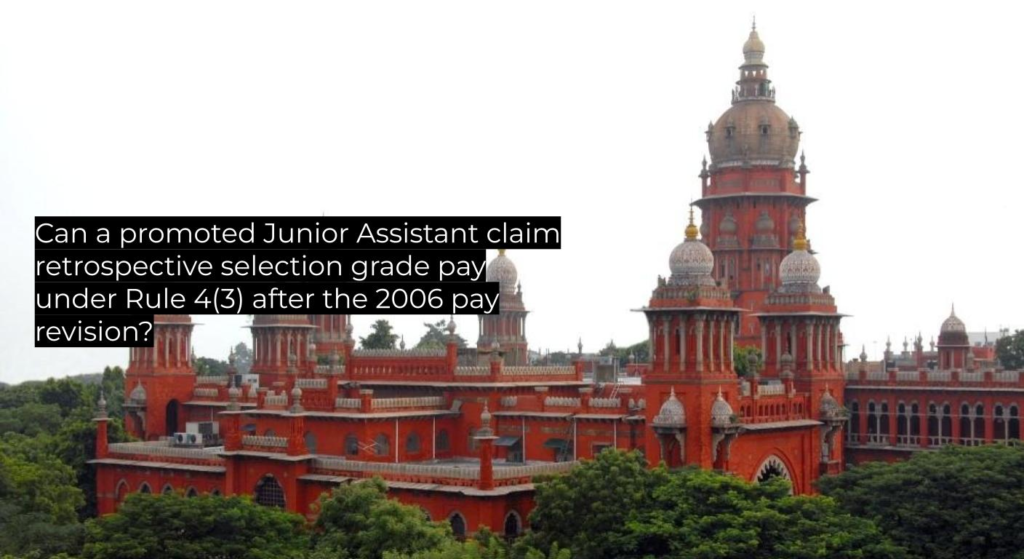 The Madurai Bench of the Madras High Court held that once an employee is promoted, entitlement to selection grade under Rule 4(3) and G.O.Ms.No.57 (Pay Cell-II) dated 28-01-1991 ceases after the 2006 scales revision embodied in G.O.Ms.No.234 (Pay Cell) dated 01-06-2009. The decision follows and affirms the common order in W.P. No. 21787 of 2014 & connected batch (05-07-2022) and serves as binding authority for pay-fixation disputes under the Tamil Nadu Revised Scales of Pay Rules.