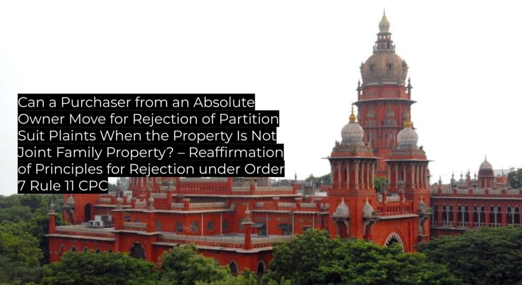 The Madras High Court upholds existing precedent that, for suits seeking partition, only co-sharers have locus standi, and where property is the absolute self-acquired property of a defendant, the plaintiff cannot claim partition as a Class-I heir of a deceased son. This judgment affirms the trial court’s rejection of plaint under Order 7 Rule 11 CPC and clarifies the rights of purchasers and the scope for rejection at the threshold. The ratio serves as binding authority within the jurisdiction for analogous factual situations.