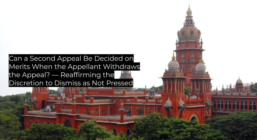The Madras High Court confirms that an appellant may withdraw a second appeal under Section 100 CPC, resulting in dismissal as “not pressed”; this upholds existing procedural law, following established precedent, and serves as binding authority for subordinate courts in civil matters.