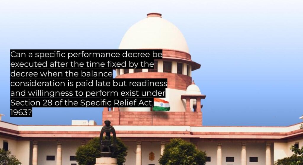 | Ratio Decidendi | The Court held that failure to deposit balance sale consideration within the decree’s fixed period does not automatically rescind the contract; under Section 28(1) the same court may extend time on terms, and a hyper-technical denial of execution petitions beyond the fixed period must be avoided. Further, once an appellate decree is final, the trial-court decree merges into it, leaving only one operative decree for execution. |