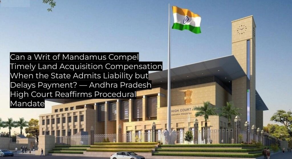 The Andhra Pradesh High Court, in a judgment delivered by a single judge, reaffirmed that when the State admits liability for compensation after land acquisition, the writ remedy of mandamus is available for directing expeditious payment. The Court upheld the established procedural rights of landowners, clarified enforceability against administrative delay, and provided clear timeline directions. The decision functions as binding authority for subordinate courts within Andhra Pradesh and carries persuasive value elsewhere.