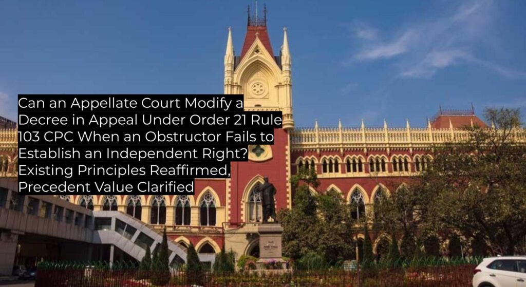 The Calcutta High Court has reaffirmed that an appellate court hearing an appeal under Order 21 Rule 103 of the Code of Civil Procedure (CPC) lacks the power to modify or alter the original trial court decree, especially where the resisting party fails to demonstrate an independent right distinct from the judgment-debtor. This ruling upholds settled precedent and is binding within West Bengal, with significant guidance for eviction and execution proceedings involving sub-tenants under the West Bengal Premises Tenancy Acts.