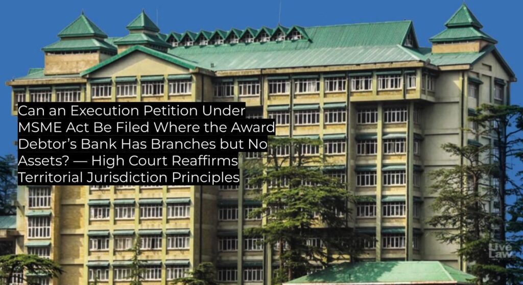 The Himachal Pradesh High Court clarified that the existence of a bank branch in a jurisdiction does not by itself confer territorial jurisdiction for execution proceedings under Order XXI of CPC; execution must be filed where the award debtor’s assets are situated. This judgment upholds existing Supreme Court precedent and serves as binding authority for subordinate courts in similar matters.