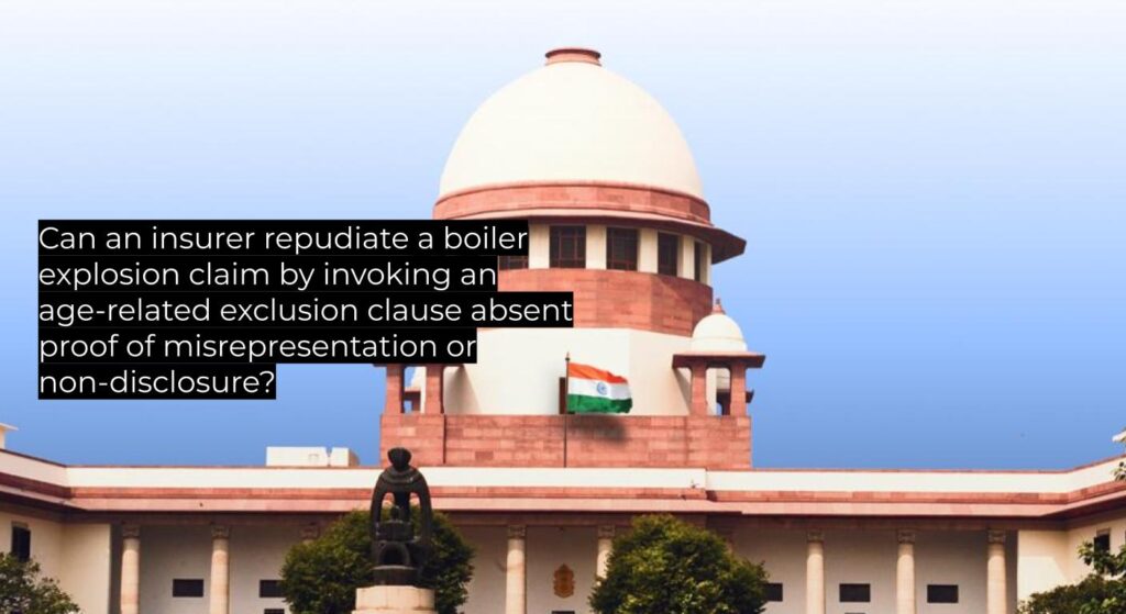 The appellant’s boiler GT-23 was insured for ₹1.60 crore from 1 February 2005 to 31 January 2006 and held a valid fitness certificate under the Boilers Act dated 17 November 2004. On 12 May 2005, the boiler exploded, detaching two tubes. The appellant’s repair-cost claim was first repudiated on 22 June 2005 and again on 3 July 2006. A consumer complaint was filed in 2007; the State Commission awarded compensation, but the NCDRC reversed that award, prompting these appeals under Article 136.