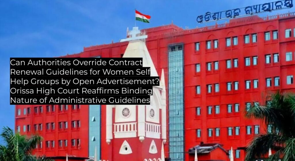 The Orissa High Court held that the 2018 Guidelines governing the selection and renewal of contracts for Women Self Help Groups (WSHGs) supplying Take Home Ration (THR) are binding in the absence of statute, and that authorities cannot bypass these by issuing open advertisements for selection. The judgment upholds longstanding legal principles on the enforceability of non-statutory guidelines and limits administrative discretion, offering binding authority for future disputes over governmental contracts in the social welfare sector.