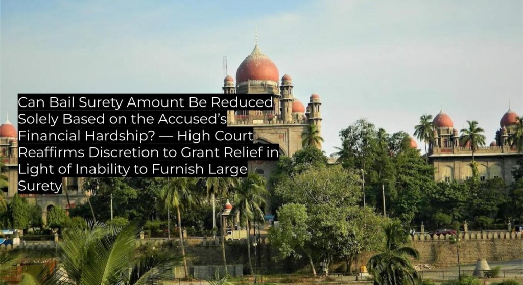 The High Court upheld the power to reduce bail surety amounts where the accused demonstrate financial incapacity, reiterating the principle that bail conditions should not be unreasonably onerous. This judgment maintains existing precedent and has binding authority for subordinate courts in Telangana, with persuasive value elsewhere, especially in cases concerning economically disadvantaged accused.