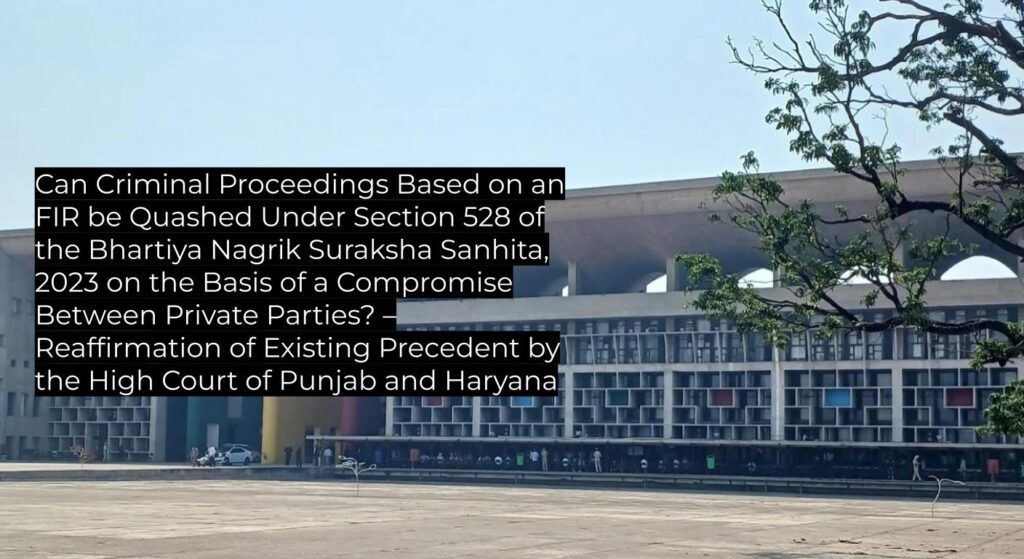 The High Court of Punjab and Haryana reaffirmed that criminal proceedings arising out of private disputes can be quashed under Section 528 of the BNSS, 2023 when parties effect a genuine compromise, following prior Supreme Court and Full Bench High Court precedents. This judgment upholds the existing legal position and serves as binding authority for subordinate courts in Punjab and Haryana, providing clarity for cases involving settlements during investigation or trial.