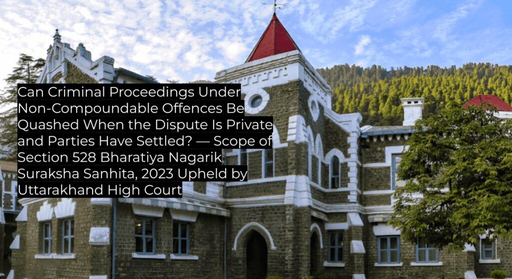 - Uttarakhand High Court reaffirmed that proceedings for non-compoundable offences can be quashed when the real dispute is civil or private in nature and settled by the parties.