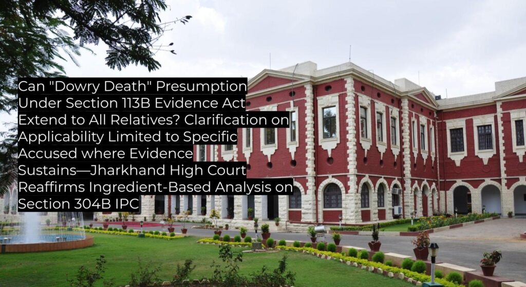 The Jharkhand High Court clarifies that presumption of dowry death under Section 113B of the Evidence Act cannot be automatically extended to all relatives of the deceased; only those against whom cogent evidence of cruelty or dowry demand soon before death exists may attract conviction under Section 304B IPC. The court upholds conviction of the husband but sets aside that of other relatives in absence of specific evidence, thus reinforcing the necessity of individualized scrutiny. The decision affirms and applies established Supreme Court jurisprudence, serving as binding authority within jurisdiction and persuasive elsewhere.