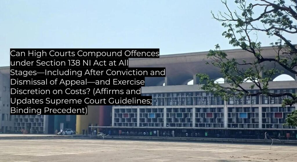 The High Court of Punjab and Haryana clarifies that offences under Section 138 of the Negotiable Instruments Act, 1881, may be compounded at any stage, even after conviction and dismissal of appeal, pursuant to Supreme Court directives (Damodar S. Prabhu, M/s New Win Export, Sanjabij Tari). The judgment reaffirms judicial discretion on waiving compounding costs in exceptional cases and serves as a binding authority on subordinate courts in the jurisdiction.