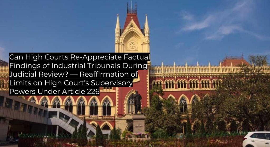 - Clarifies the High Court’s limited role under Article 226 when reviewing findings of industrial tribunals: only manifest perversity, jurisdictional error, or violation of natural justice permits interference.