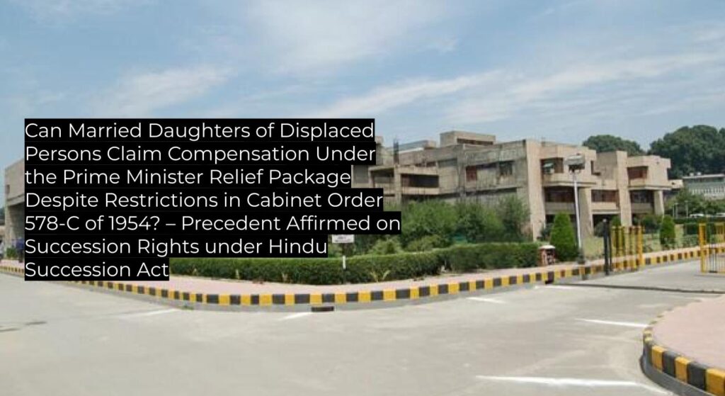 The High Court clarifies that the Prime Minister Relief Package compensation for displaced families of POK is governed by the Hindu Succession Act, 1956, and not limited by Cabinet Order 578-C of 1954’s restrictions on married daughters. The judgment upholds existing precedent, providing binding authority for future disputes regarding entitlement of married daughters to compensation.