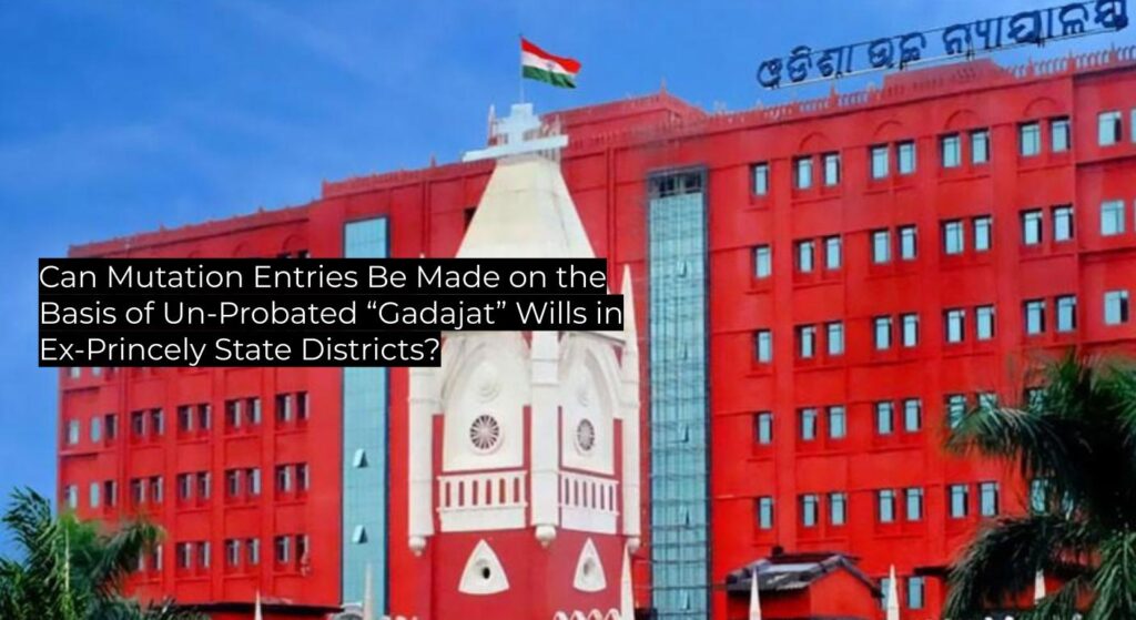 | Logic / Jurisprudence / Authorities Relied Upon by the Court | Relied on a consistent line of Orissa High Court decisions holding that “Gadajat Wills” do not require probate; Government of Odisha Letter No.23734/13.08.2019 modifying Letter No.16449/07.05.2018; principles that revenue authorities lack jurisdiction to decide substantive title or genuineness of wills. |