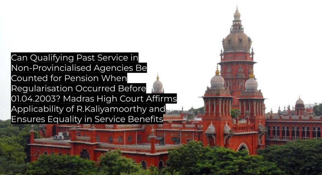 - The Madras High Court Division Bench explicitly applies R.Kaliyamoorthy FB order as binding precedent: service in non-provincialised agencies, if regularised before 01.04.2003, counts for pension.