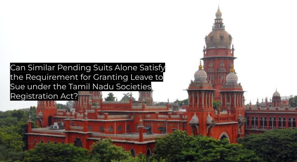 | Questions of Law | Can leave to sue under the Tamil Nadu Societies Registration Act be granted solely on the basis of similar pending suits? |