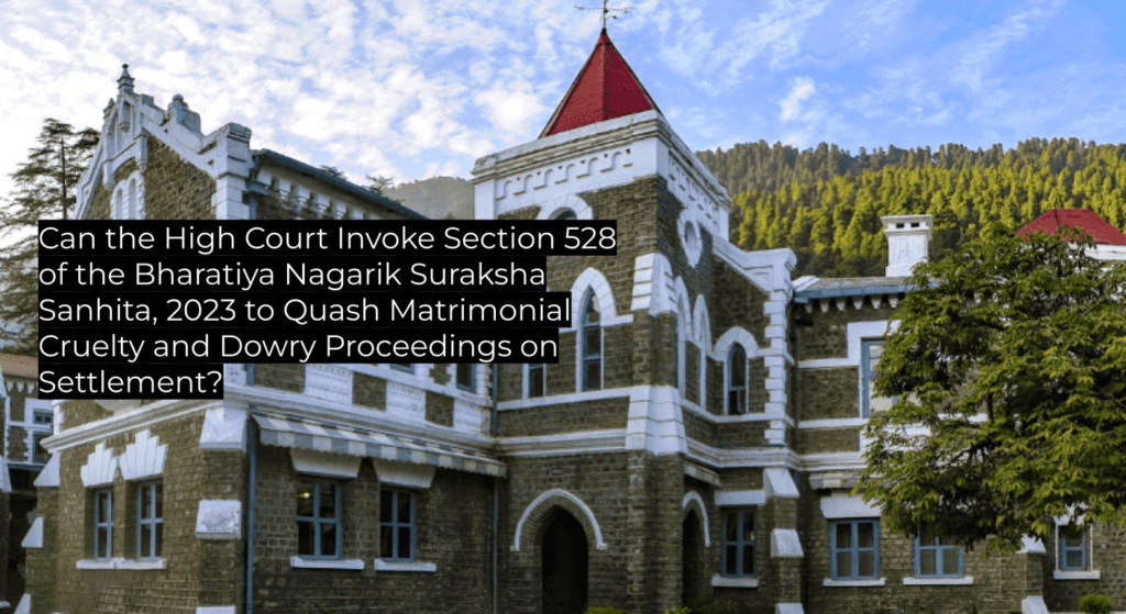 | Questions of Law | Can the High Court, under Section 528 of the Bharatiya Nagarik Suraksha Sanhita, 2023, quash criminal proceedings pending under Sections 323, 498A, 504, 506 IPC and Sections 3 & 4 of the Dowry Prohibition Act upon a matrimonial settlement and compounding application? |