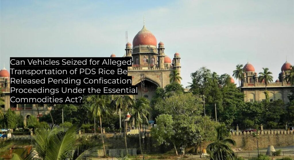 The High Court for the State of Telangana reaffirmed its power to direct conditional release of vehicles seized under allegations of transporting Public Distribution System (PDS) rice, pending the outcome of confiscation proceedings under Section 6-A of the Essential Commodities Act, 1955. This decision follows earlier precedent, providing clear authority for lawyers seeking similar interim relief in future seizures, especially within Telangana.