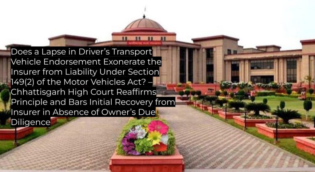 Chhattisgarh High Court has held that where the driver of the offending vehicle lacked a valid and effective licence for a ‘Transport Vehicle’ on the date of accident, and the owner failed to demonstrate due diligence, the insurer stands exonerated and the liability to compensate third-party claimants rests solely on the owner. The decision applies precedent from the Supreme Court and clarifies the allocation of liability, serving as binding authority within Chhattisgarh.