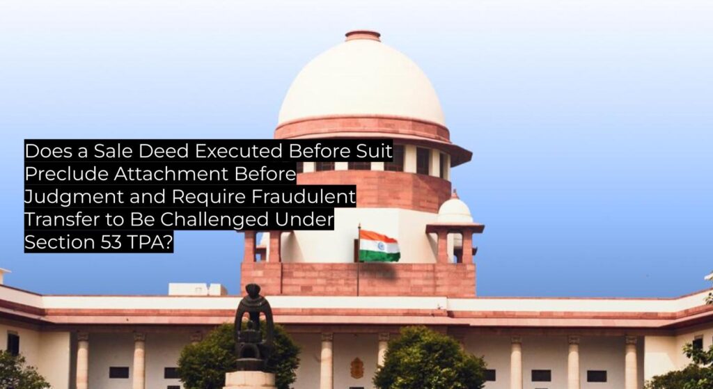 | Questions of Law | Whether a sale deed executed prior to institution of suit precludes attachment before judgment under Order XXXVIII Rule 5 CPC, and whether fraudulent transfer must be challenged exclusively under Section 53 of the Transfer of Property Act |