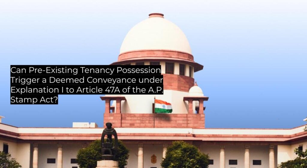 The respondent had leased a plot in Andhra Pradesh to the appellant for over fifty years. On 14 October 2009 they executed an agreement to sell for ₹9 lakh, of which ₹6.5 lakh was paid as advance. The appellant sued for specific performance and tendered the agreement in evidence; the respondent denied its validity. The Trial Court and Andhra Pradesh High Court held the pact was a “deemed conveyance” under Explanation I to Article 47A, directing payment of additional stamp duty and penalty. Separately, the appellant was evicted under the A.P. Rent Act in January 2017. The Supreme Court granted leave to appeal.