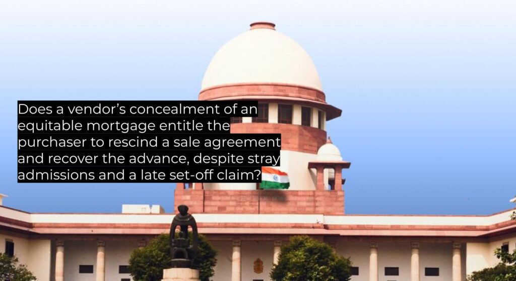 | Facts as Summarised by the Court | The vendor agreed to sell 77.26 acres for ₹4.45 cr, received ₹55 lakh in advances, but concealed a bank mortgage. On discovery, he promised to redeem the mortgage, reduced the price by ₹35 lakh, took further payments, then sold to a third party at ₹3.675 cr and claimed a set-off of ₹77.5 lakh loss. The trial Court granted refund; the High Court remanded; the Supreme Court restored the refund decree. |
