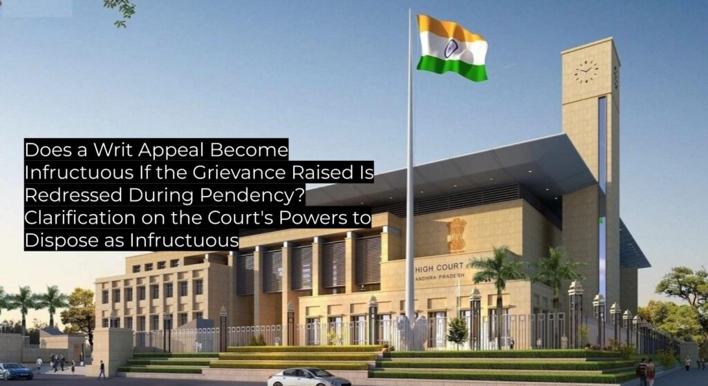 The High Court clarifies that once the underlying grievance—here, the issuance of a community certificate—is redressed during the pendency of the writ appeal, the matter is rendered infructuous and should be dismissed as such. The decision reaffirms existing procedure and is binding authority within the Andhra Pradesh High Court’s jurisdiction.