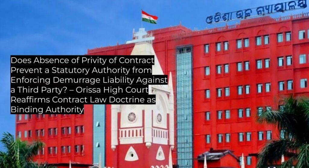 Orissa High Court holds that a statutory port trust cannot enforce demurrage charges against a party who is not privy to its contract with the State, reaffirming the doctrine of privity of contract; liability for demurrage rests with the State where so acknowledged in prior proceedings. The judgment follows established precedent and is binding on subordinate courts within Odisha, offering clear guidance for public sector and shipping/port law disputes.