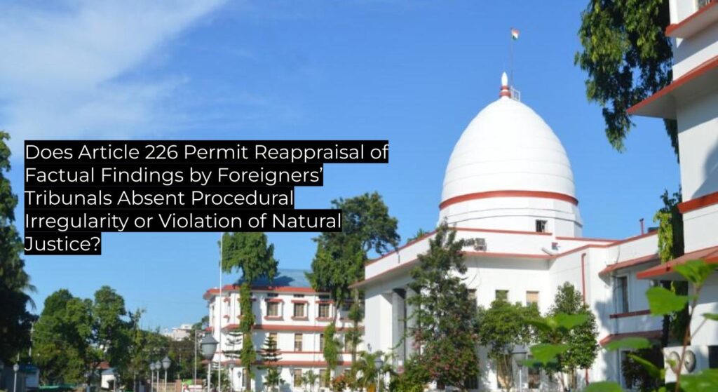 The Gauhati High Court clarifies that the writ jurisdiction under Article 226 does not extend to re-evaluating evidentiary appreciation by Foreigners’ Tribunals unless there is a procedural violation or denial of natural justice. The judgment upholds established precedent on the standard of judicial review in such cases, affirming that factual findings by Tribunals are not to be disturbed in the absence of illegality or perversity. The ruling is binding within the State of Assam and persuasive for similar citizenship determination matters.