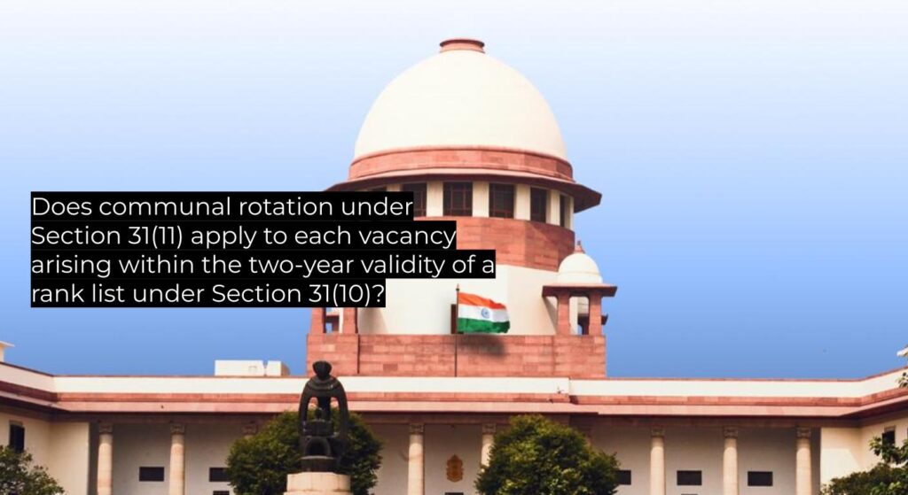 | Questions of Law | Whether a rank list valid for two years under Section 31(10) must still see each arising vacancy filled by communal rotation under Section 31(11), or if rotation waits until expiry of the list. |