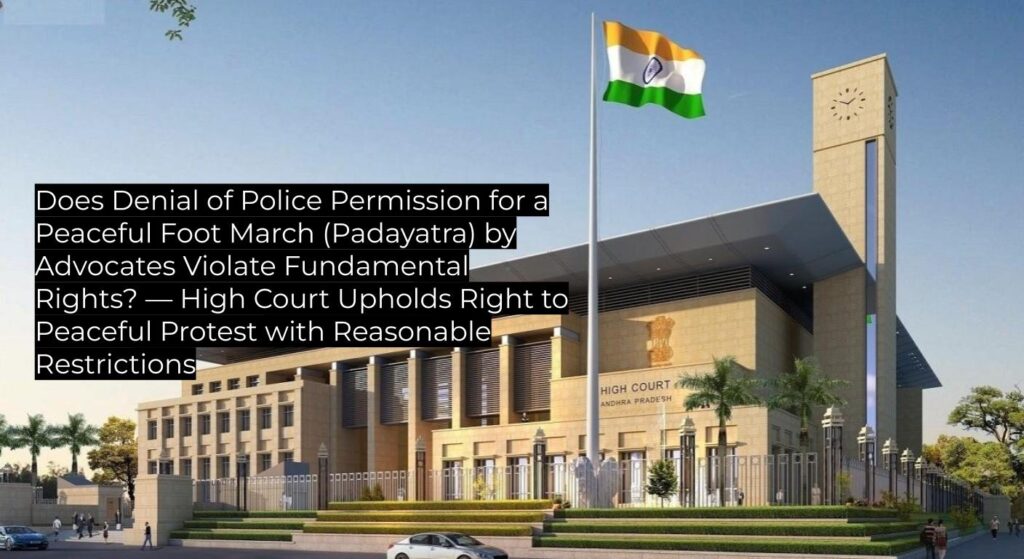 The petitioners, one being a practicing advocate and the other an advocates’ association via its general secretary, proposed to undertake a nearly 20-person foot march (padayatra) from Dhone to Amaravati. The stated purpose was to press for the passage of a bill for the protection of advocates. Their request for permission, communicated to the police on 09.05.2025, was not considered. Aggrieved by this inaction, the petitioners filed a writ petition under Article 226 before the Andhra Pradesh High Court.