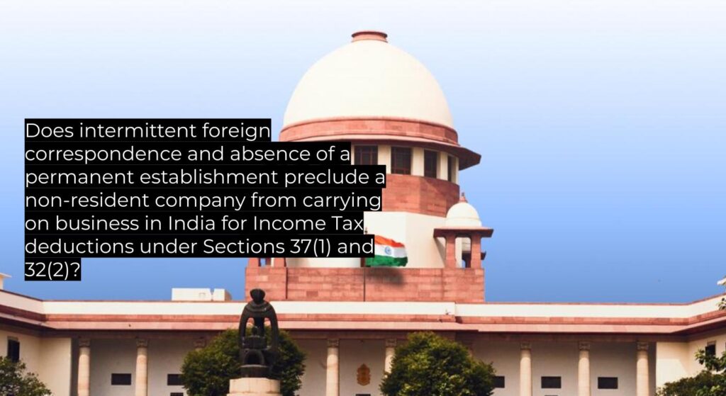 | Questions of Law | Whether a non-resident company can be deemed to carry on business in India, despite a gap in contracts and absence of a permanent establishment, so as to claim deductions under Sections 37(1) and 32(2) read with Section 71 of the Income Tax Act. |