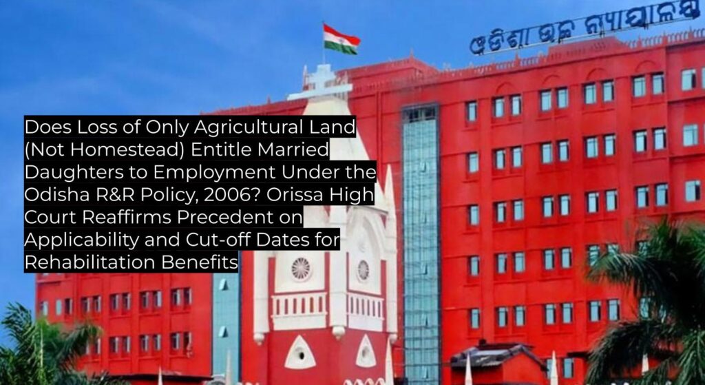 The Orissa High Court held that acquisition of solely agricultural land, without the acquisition of homestead land, does not confer a right to employment under the Odisha Resettlement and Rehabilitation Policy, 2006, for married daughters. The Court upheld the implementation of cut-off dates, reaffirming established interpretation, and clarified the evidentiary requirements for such claims. This judgment functions as binding precedent within the State of Odisha for future land acquisition rehabilitation matters.
