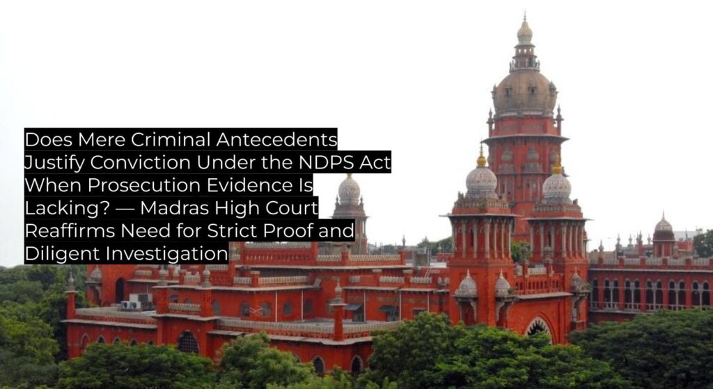 The Madras High Court allowed the appeal, acquitted the accused of NDPS charges, and clarified that prior criminal antecedents cannot form the basis for conviction absent credible evidence, setting an important precedent for NDPS prosecutions and standards of police investigation. This judgment upholds Supreme Court authority and is binding precedent for subordinate courts in Tamil Nadu.