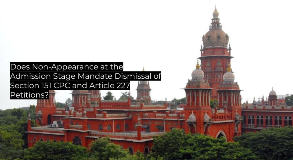 - Confirms that failure to appear at the admission hearing of Section 151 CPC applications or Article 227 revisions in the Madras High Court results in outright dismissal without consideration of merits.