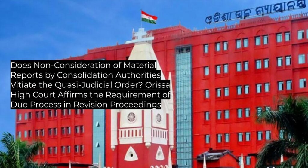 The Orissa High Court has held that failure by the Land Reforms Commissioner-cum-Commissioner Consolidation and Settlement to consider relevant reports—specifically those called for clarification during the pendency of a consolidation revision—renders the order unsustainable. This judgment affirms established precedent that adherence to principles of natural justice is mandatory in quasi-judicial proceedings, particularly under the Orissa Consolidation of Holdings and Prevention of Fragmentation of Land Act, 1972. The ruling serves as binding authority within the State of Odisha for land consolidation matters.