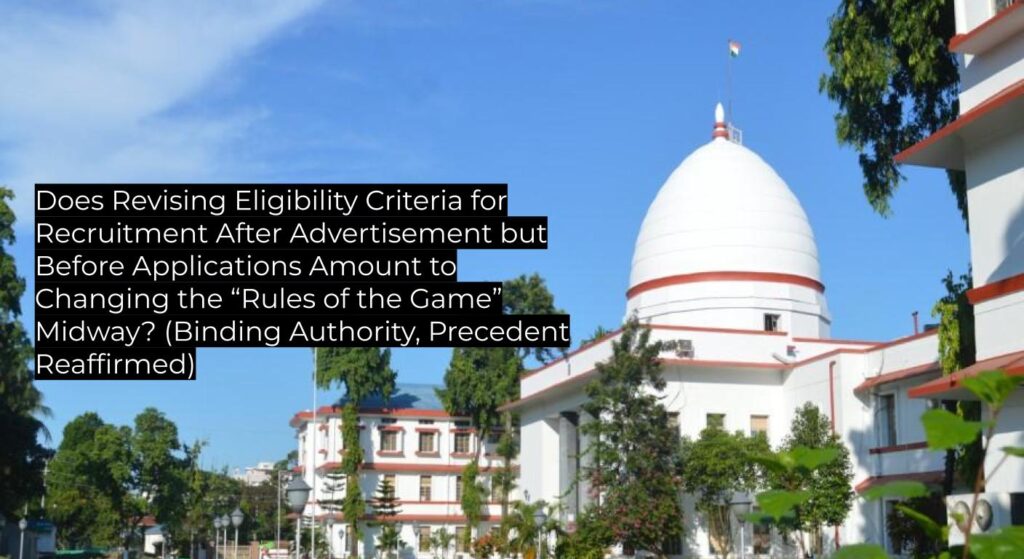 The Gauhati High Court has reaffirmed that changing eligibility criteria for recruitment by amending service rules after an initial advertisement but before actual commencement of the recruitment process (i.e., before call for subject-wise applications) does not amount to impermissibly changing the “rules of the game” midway, provided the amended rules are in force when the effective recruitment process begins. This judgment upholds Supreme Court precedent and is binding on subordinate courts in Assam.
