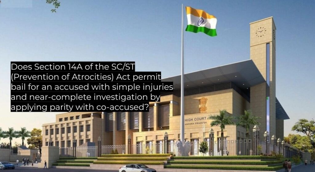 Questions of Law Whether an accused can be granted bail under Section 14A of the SC/ST Act when the victim’s injuries are simple, investigation is nearly complete, and a co-accused is on bail.